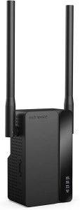 1200Mbps WiFi Range Extender, Wireless Signal Repeater Booster – Works with ethernet and WiFi, is super easy to install and has four dual antennas for optimal coverage.