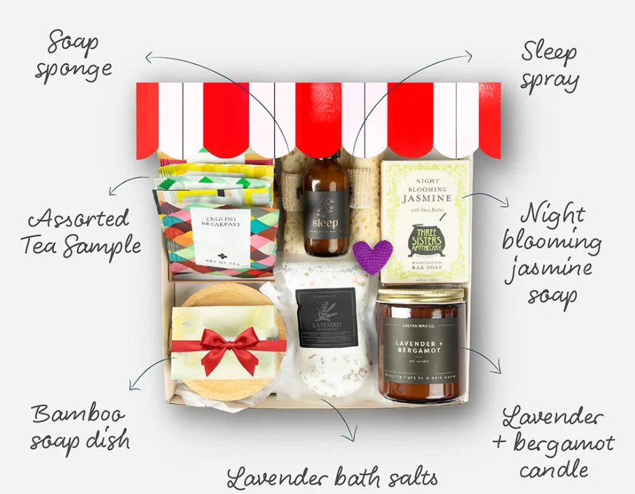 The Sweet Dreams set from Sugarwish turns gifting into an experience by letting the recipient choose their curated assortment after receiving a personalized eCard. Once selected, the set arrives beautifully packaged with sleep-supporting essentials, including a soap sponge, a soothing night spray, jasmine soap, assorted tea samples, a bamboo soap dish, lavender bath salts, and a lavender and bergamot candle. Everything inside is designed to create a calming nighttime ritual that helps quiet the mind and wind down after long days.