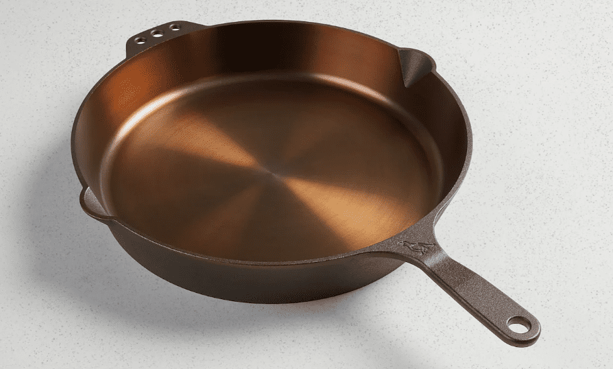 Smithey’s No. 14 skillet is the pan you reach for when you are cooking for a crowd. With a wide 14-inch top diameter and a polished cooking surface, it can handle anything from searing several steaks at once to crisping potatoes or finishing a large cornbread in the oven. The interior arrives satin smooth and pre-seasoned with oil, so it builds a naturally nonstick finish over time without relying on synthetic coatings. Pour spouts, a traditional handle, and hanging holes on both sides round out the thoughtful design.