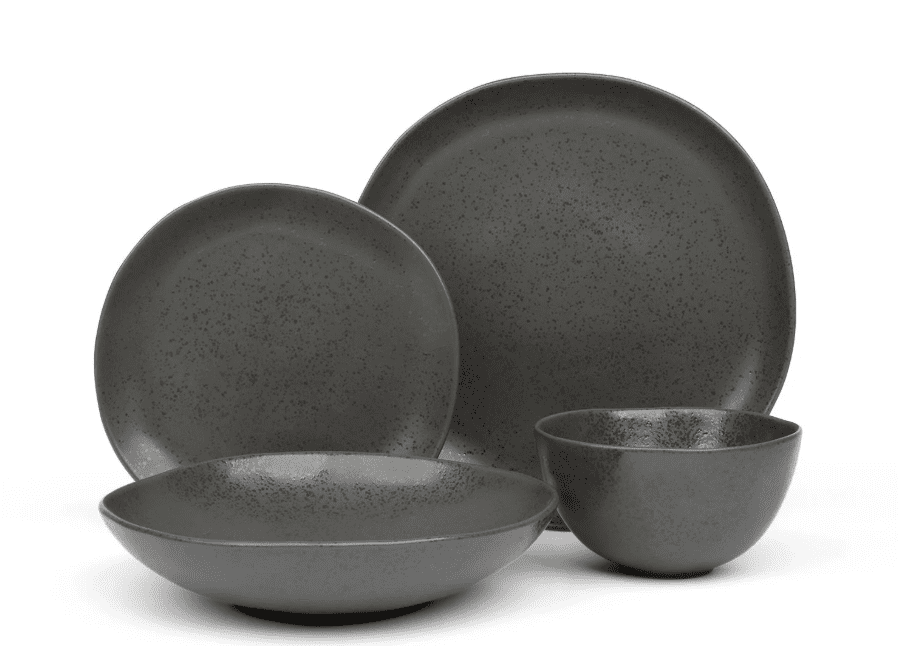 Larder & Vine’s Urban Stoneware brings a rich, moody aesthetic to everyday dining. Each piece is handcrafted using Ecogres, a next-generation clay made from 90% recycled natural materials, then high-fired in Portugal to create durability and depth of color. The glaze blends matte and semi-matte textures, giving the set visual dimension and a soft, sophisticated character. The organic contours feel artisan-made rather than factory smooth, which adds a personal touch to any table setting.
