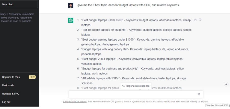 You can use ChatGPT prompts to get topic ideas for your content needs. For example, you are writing content around laptops. Put “ Give me the 8 best topic ideas for budget laptops with SEO, and relative keywords.”