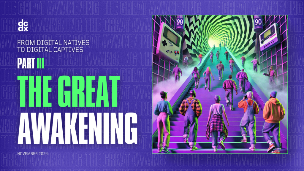 In 2024, dcdx released a three-part study titled From Digital Natives to Digital Captives. The series explored how constant connectivity has shaped Gen Z’s identity, their growing desire to unplug, and what the company described as a broader “awakening” toward more intentional living.