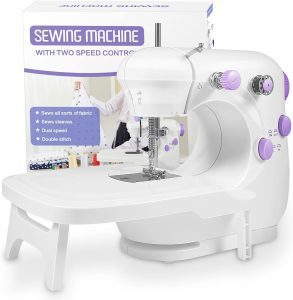 The Vadaap Sewing Machines, designed with beginners in mind, is a portable, multifunctional sewing machine that features double thread and double speed control. It’s easy to operate, requiring no assembly, and its compact size makes it highly portable. This machine is equipped with a built-in light, thread trimmer, extension table, and foot pedal switch, ideal for designing large projects even in low-light conditions.