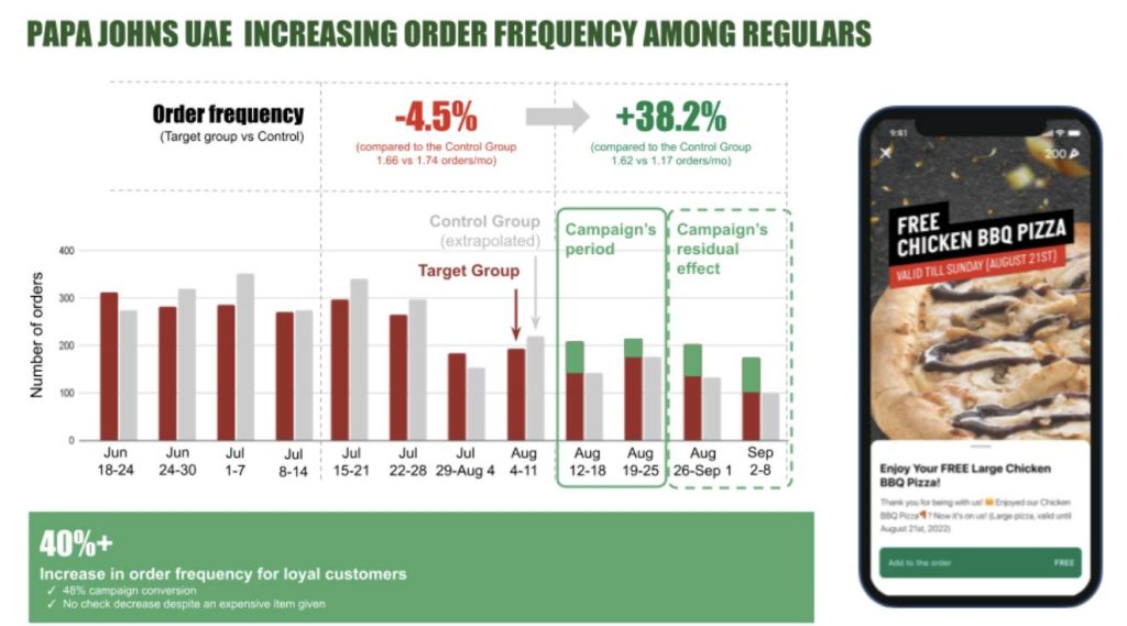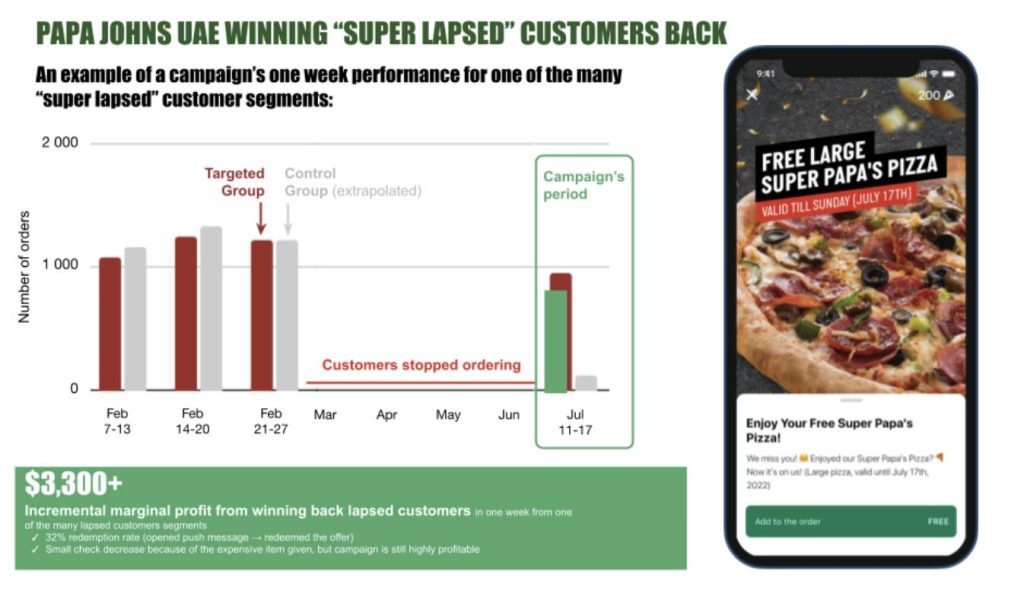 Utilizing LoyaltyPlant’s cutting-edge technology, Papa Johns UAE implemented an award-winning customer engagement strategy. Their primary goal was to win back “super-lapsed” customers who had not ordered in a long time (4-12 months). The customers were segmented based on their purchase history, and relevant complimentary items were sent along with a “We miss you!” message.