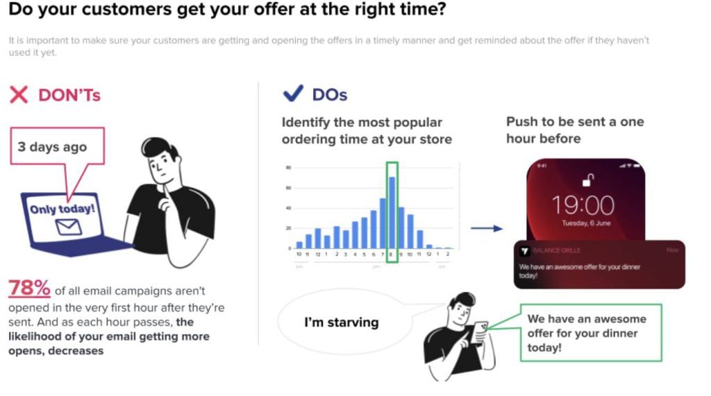 LoyaltyPlant platform enables you to analyze the peak hours of order volume and predict the ideal time to send push messages to achieve the highest open rate and conversion