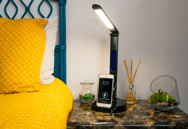 The LumiCharge was designed to help boost productivity by eliminating clutter around your desk space. The lamp has one cord built into it but has a universal phone charger at the base of the lamp. The lamp allows you to charge your phone, check the time, and plug in extra devices in the lamps two extra USB ports.