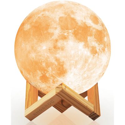 This moon lamp is one of our favorite ones! We love the hand structure that provides a unique touch to the moon. The moon night light with a rechargeable battery is made by 3D technology with eco-friendly materials – charging time is approximately two to three hours, use period is approximately eight to ten hours. The color can be changed to white and yellow, and the brightness can be adjusted by long pressing – dimming is enabled only by long pressing. There is a mini touch switch that is separated from the charging port, making it easy for users to manipulate. The hole for assembling the moon is only 2cm in diameter, which allows the moon’s shape to be maintained. It is packaged in a box and shows the real surface of the moon in 3D.