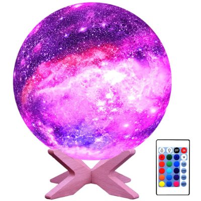 This lamp provides a realistic moon shape enhanced by a decorative art drawing of a galaxy that provides the lamp with a colorful and charming appearance. Based on NASA satellite data, the lunar swirls and craters effect of the moon’s surface are created. With this moon lamp, there is a new operating model, sliding control is more interesting for children than touch control. The moon lamp’s brightness can be adjusted by sliding the control when in the three-color light mode. Using the sliding control, you can switch between 16 colors in the multi-color of fade mode or flash mode. This colorful starry moon lamp is the perfect gift for kids, parents, and family members on birthdays, Christmas, or any other holiday.