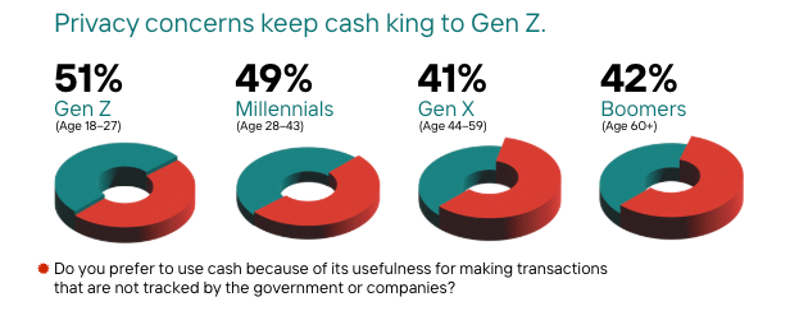 As recently as 10 years ago, the idea of a society that didn’t run on paper cash was unthinkable. But now, half of Americans (51%) say they’re open to it — and according to ILF, this number is expected to increase. Of those who want to keep cash around, Gen Zers were most likely to cite privacy concerns as their reason for not giving it up yet.