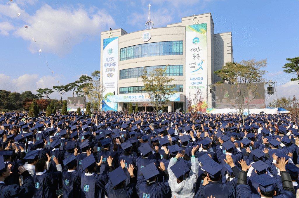 Meanwhile, the graduation ceremony was held under the theme “Love and Blessing, Light That Shines on the World.” About 20,000 graduates filled the interior and exterior of Shincheonji Cheongju Church. Due to limited space, additional graduates participated online from Shincheonji churches in Korea and abroad, creating a global atmosphere of celebration.